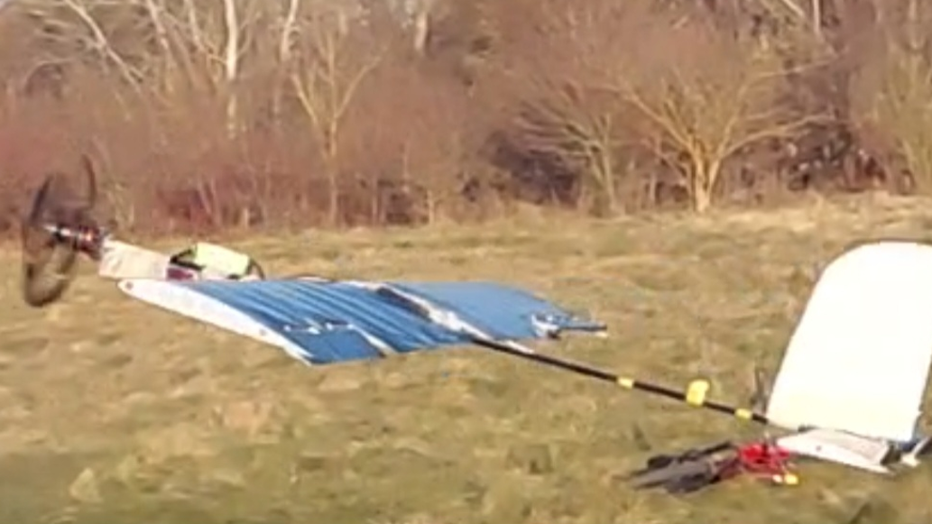 Airplane V7 was virtually fully made out of foamboard, with the exception of the 3D-printed ribs. As can be seen on the image, after a rough landing (CG was to far forwards) it was repaired using masking tape. The plane flew for a total of 8.5 minutes in one flight, which is my current record.