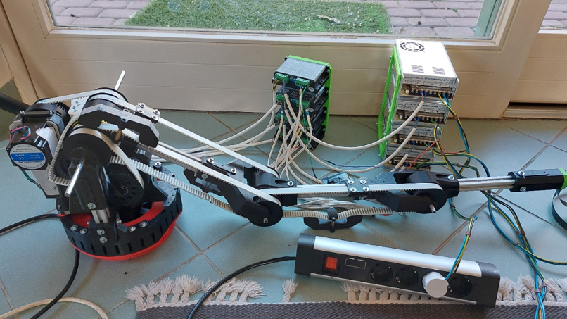 This is the completed robot arm. The Nema 23 motors are housed in the base of the arm, which aims to increase its maximum payload. This choice resulted in challenges with belt routing and vibrations due to belt elasticity but altogether it led to a net benefit. The electronics used were DM556T drivers, 48V power supplies, and a Raspberry Pi.