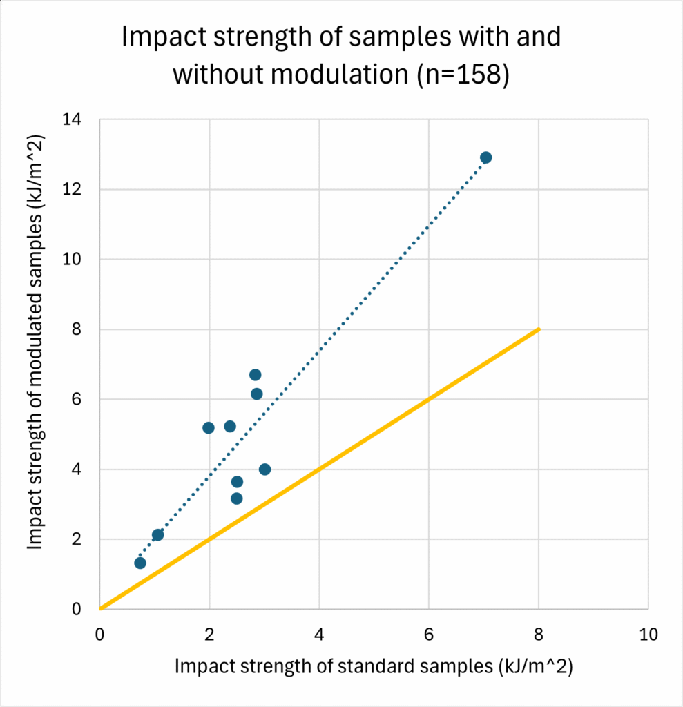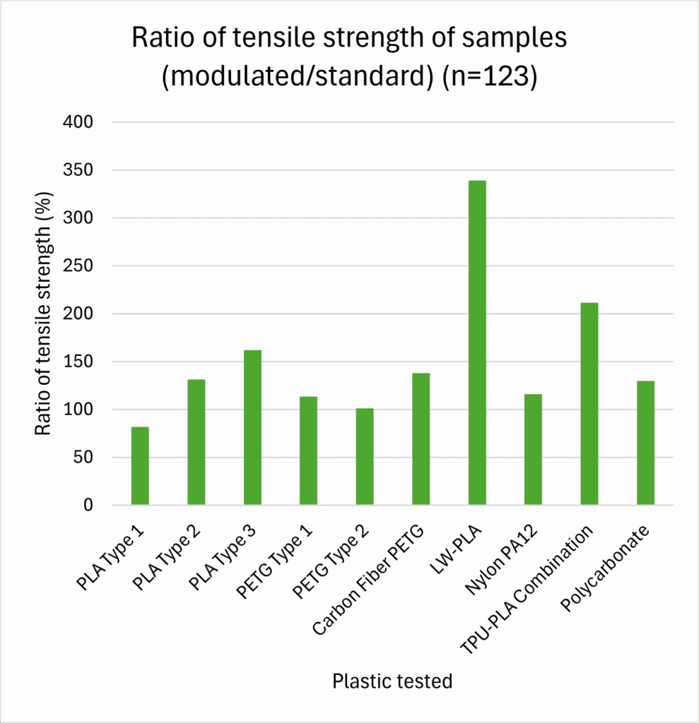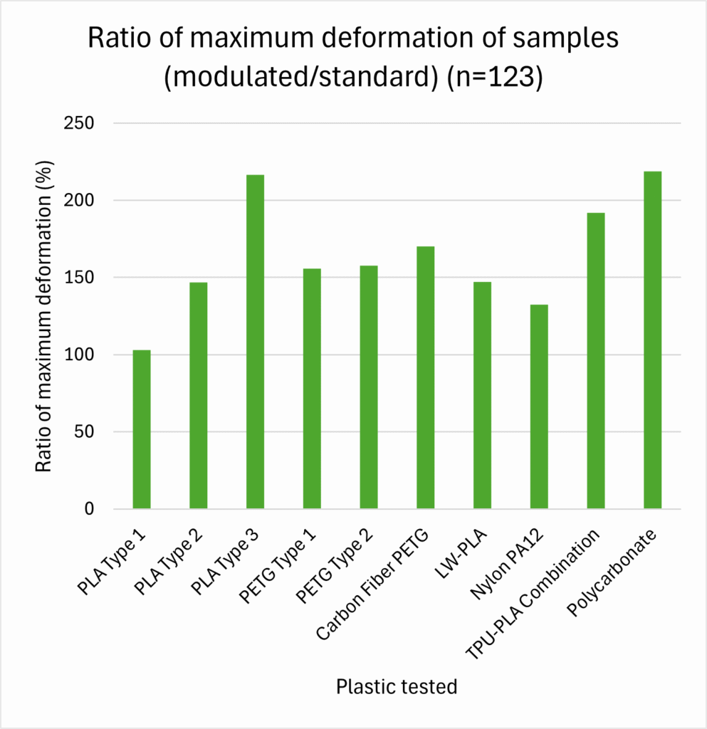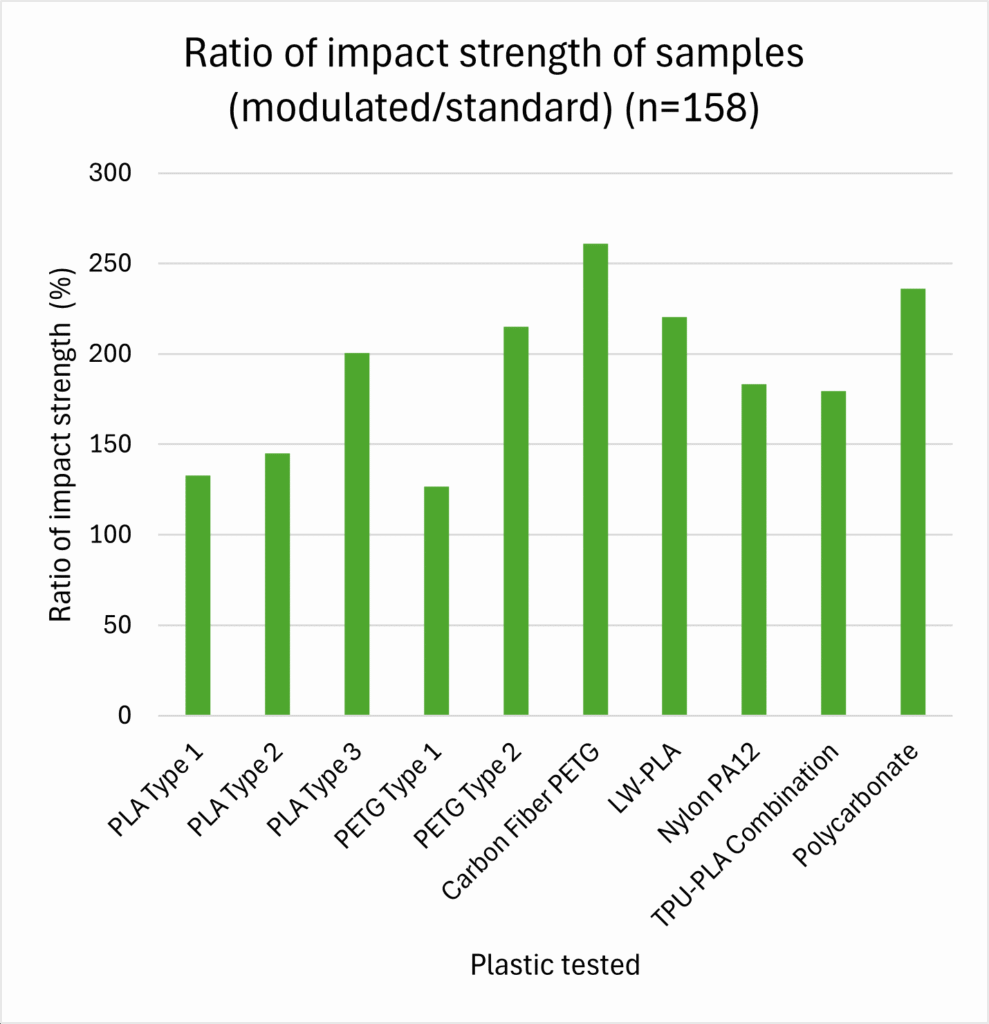The technique proved to significantly increase the tensile strength, maximum deformation before failure, and impact strength of several plastics (Table 1). Compared to standard parts printed under identical conditions, modulated parts showed, on average, 152% of the tensile strength, 164% of the maximum deformation, and 190% of the impact strength (Figures 3 and 4). These increases were even more notable with engineering and specialized filaments, which showed 187% of the tensile strength, 172% of the maximum deformation, and 216% the impact strength compared to standard samples printed under identical conditions.