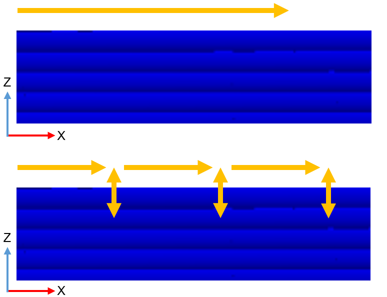 Figure 1: Movement of the printhead (orange arrows) using a standard technique (top), and technique with Z-axis modulation (bottom).